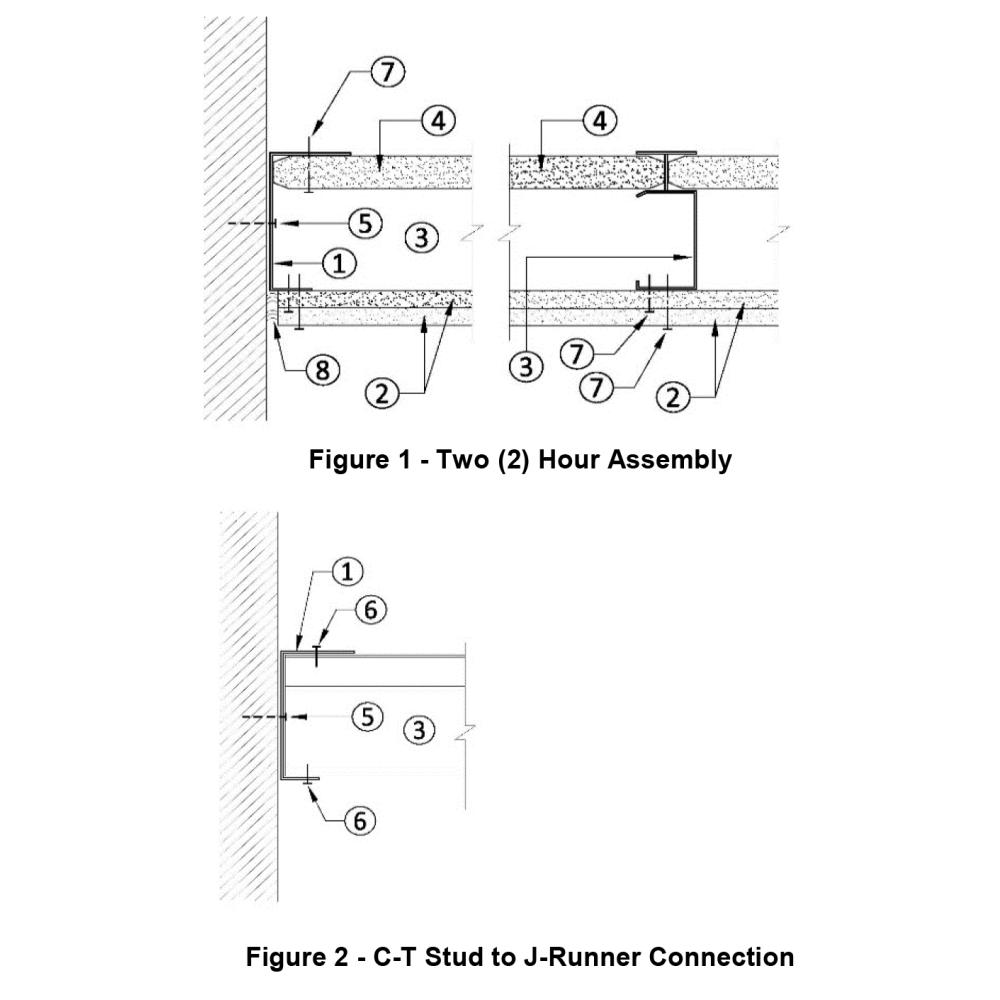 - A minimum 2-1/2" deep ClarkDietrich C-T Studs 22mils (25 gauge), centered between the top and bottom J-Tracks with a minimum 1/2" clearance from the web of the J-Tracks.