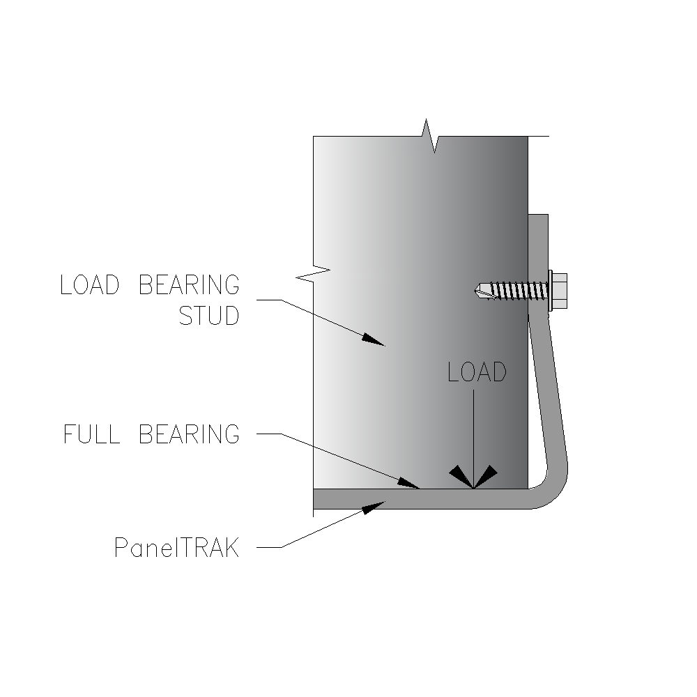 PanelTRAK incorporates a web slightly wider than the accompanying stud width, and has the legs bent inward, just under 90 degrees.  This locates the bend radii of the track outside the plane of the bearing stud with the leg ends matching the width of the bearing stud.  Thus, allowing the load bearing stud to directly seat/bear on the track web. PanelTRAK can be used in axial loadbearing walls, curtain walls, tall interior partitions, floor joists and roof truss assemblies.