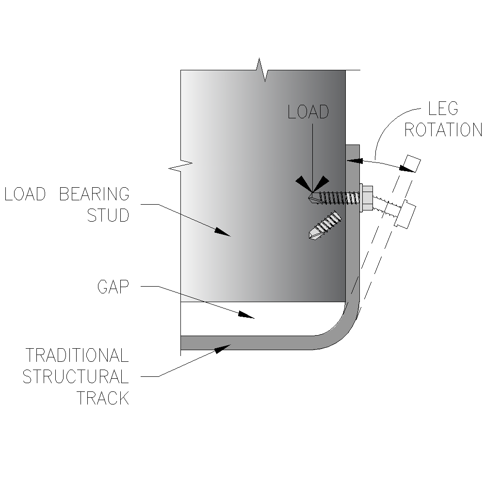 The bend radius between the web and legs of a traditional structural track create a gap between the load bearing stud and the track; keeping the bearing stud from seating/bearing on the track web.  When a load is applied on the stud(s) the gap closes; resulting in shearing of the fastener or bending of the flange and pullout of the fastener.