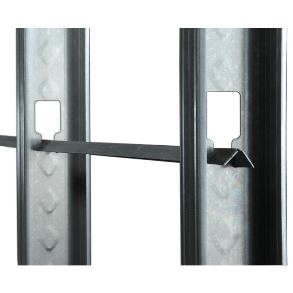The Spazzer 9200 Spacing Bar is a prenotched bridging and spacing bar that facilitates the rapid erection of interior, nonload-bearing, nonstructural studs into a rigid, accurately laid out gridwork that has excellent resistance to stud rotation and displacement. Spazzer 9200 bar is a 33mils (20ga) bar that is 50" long and prenotched to hold studs rigidly on 16" or 24" centers. The slots have been pre-engineered to hold studs in place by utilizing “shear” to bridge studs into a rigid gridwork.