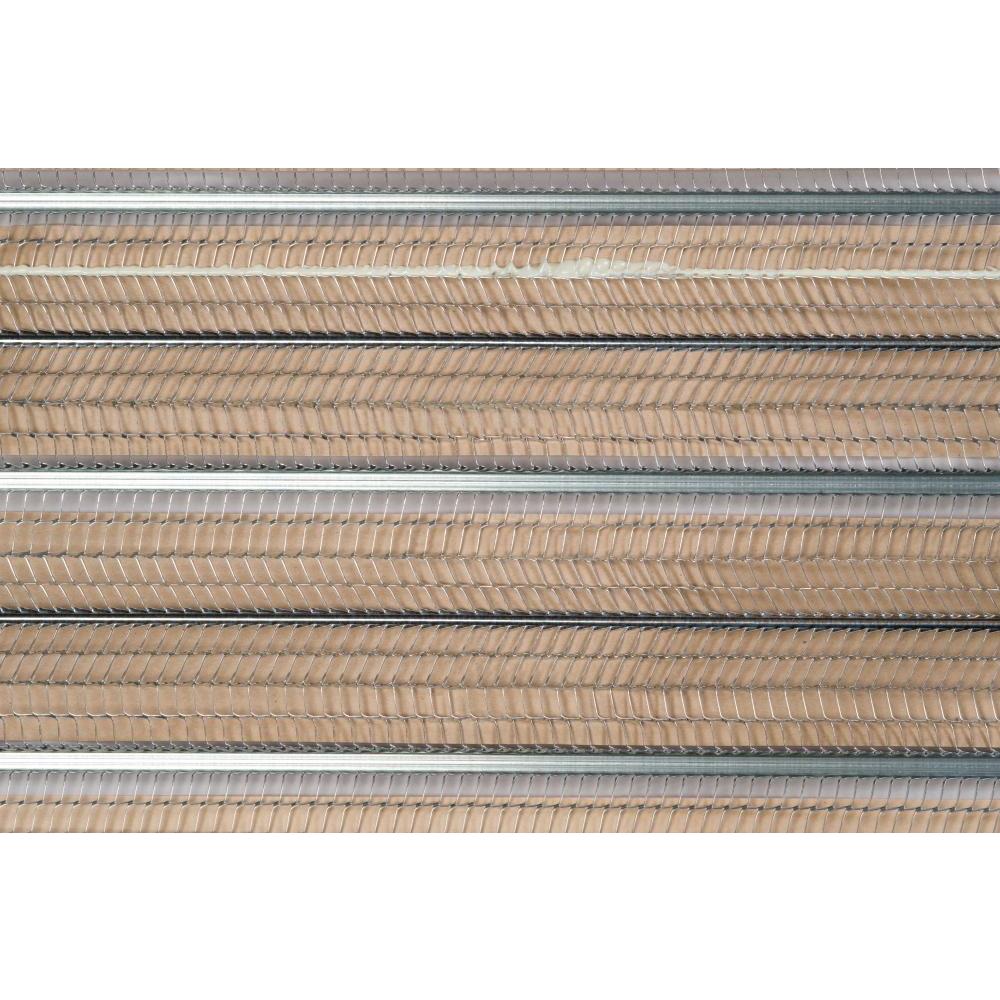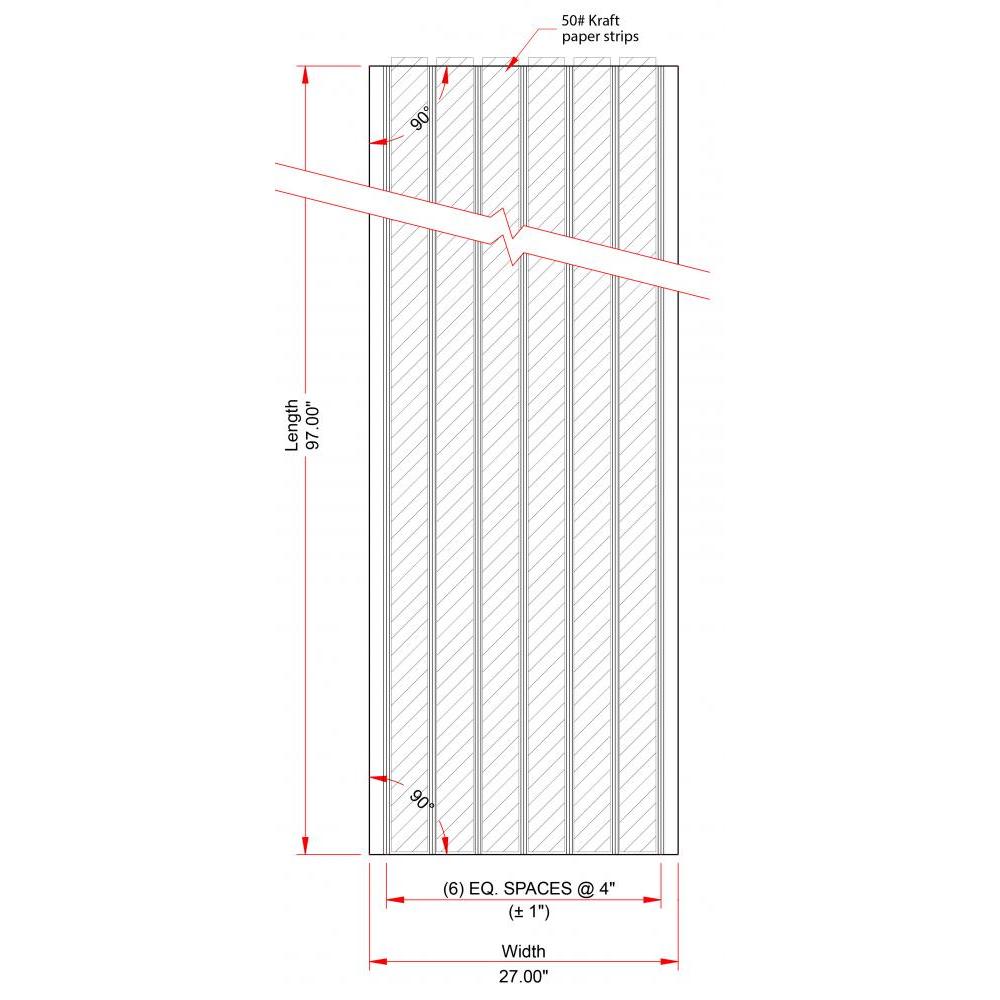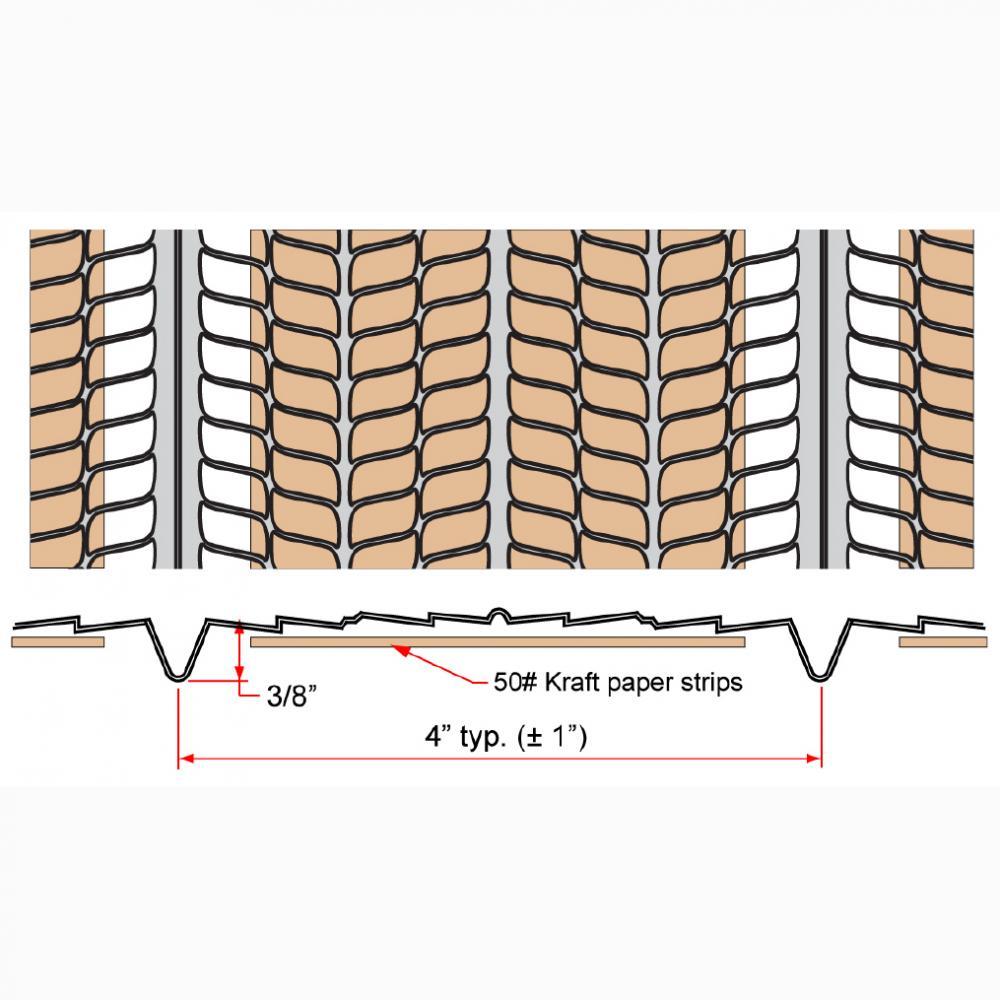 3-3/16" wide strips of plain 50lb kraft paper spot attached with glue between the herringbone mesh pattern with seven, 3/8" deep longitudinal solid steel ribs spaced at 3-7/8" intervals across the sheet.