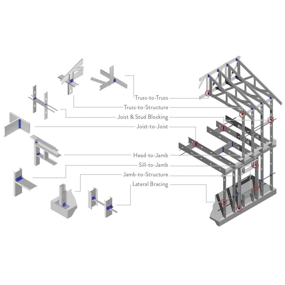 Pre-punched SwiftClips™ are used for multiple construction applications. They are commonly used for lateral bracing CRC connections, header & sill connections and floor joist hangers. The L-shaped clips fit between the stud flanges, so that shorter length clips do not need to be ordered.