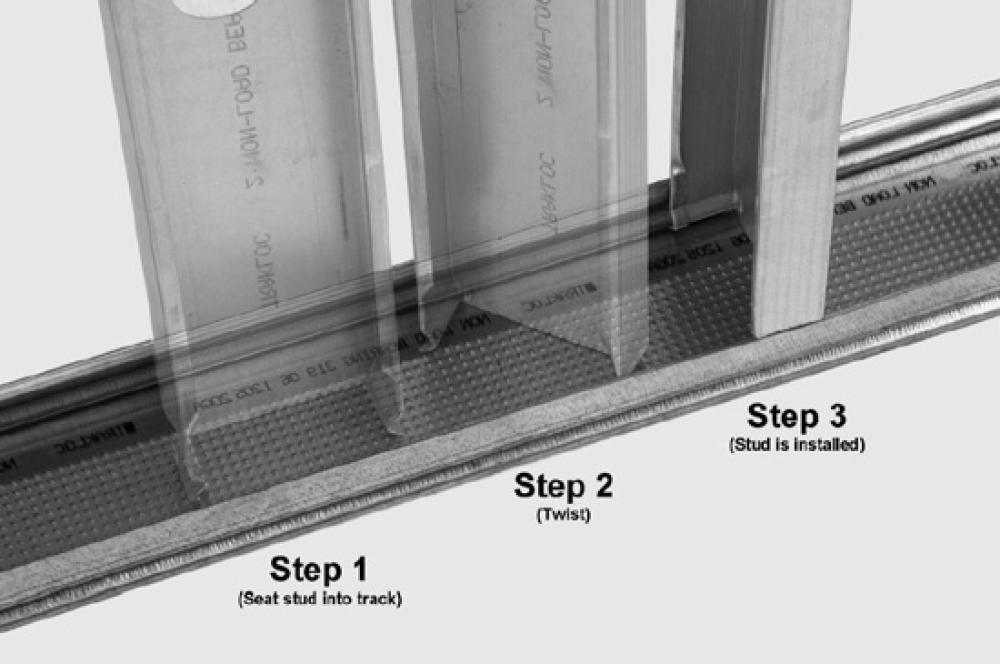 • TRAKLOC has an ICC-ESR-1464 code approved stud-to-track connection where the stud twists and locks into the top and bottom track without the use of mechanical fasteners.