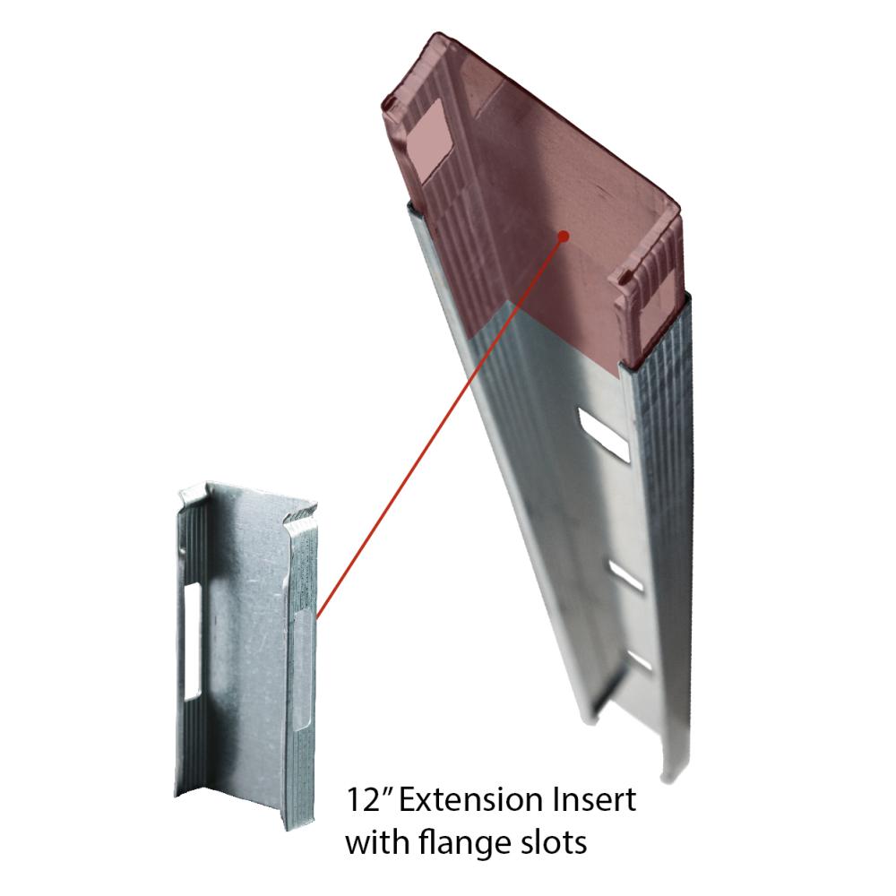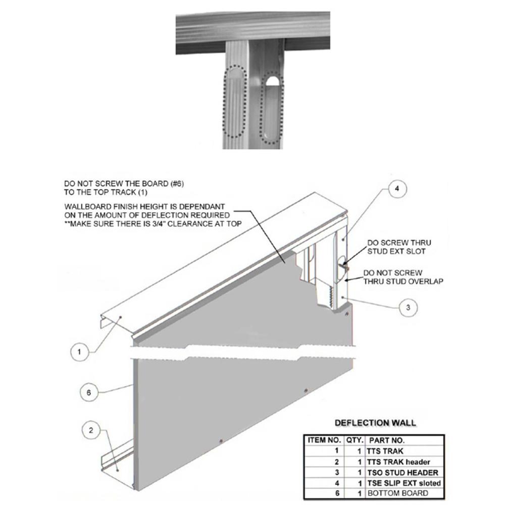 Trakloc’s deflection insert provides a full inch of deflection (+/- ½”) while also allowing for 2 inches of stud height variability. As illustrated in the Component section, the deflection insert (TSE w-Deflection) and Trakloc’s standard insert (TSE) are the same, except the deflection insert has a 3” x 3/4" slot punched into the top of each flange. These slots allow the drywall screw to pass through the board and the TSO, while avoiding contact with the TSE.