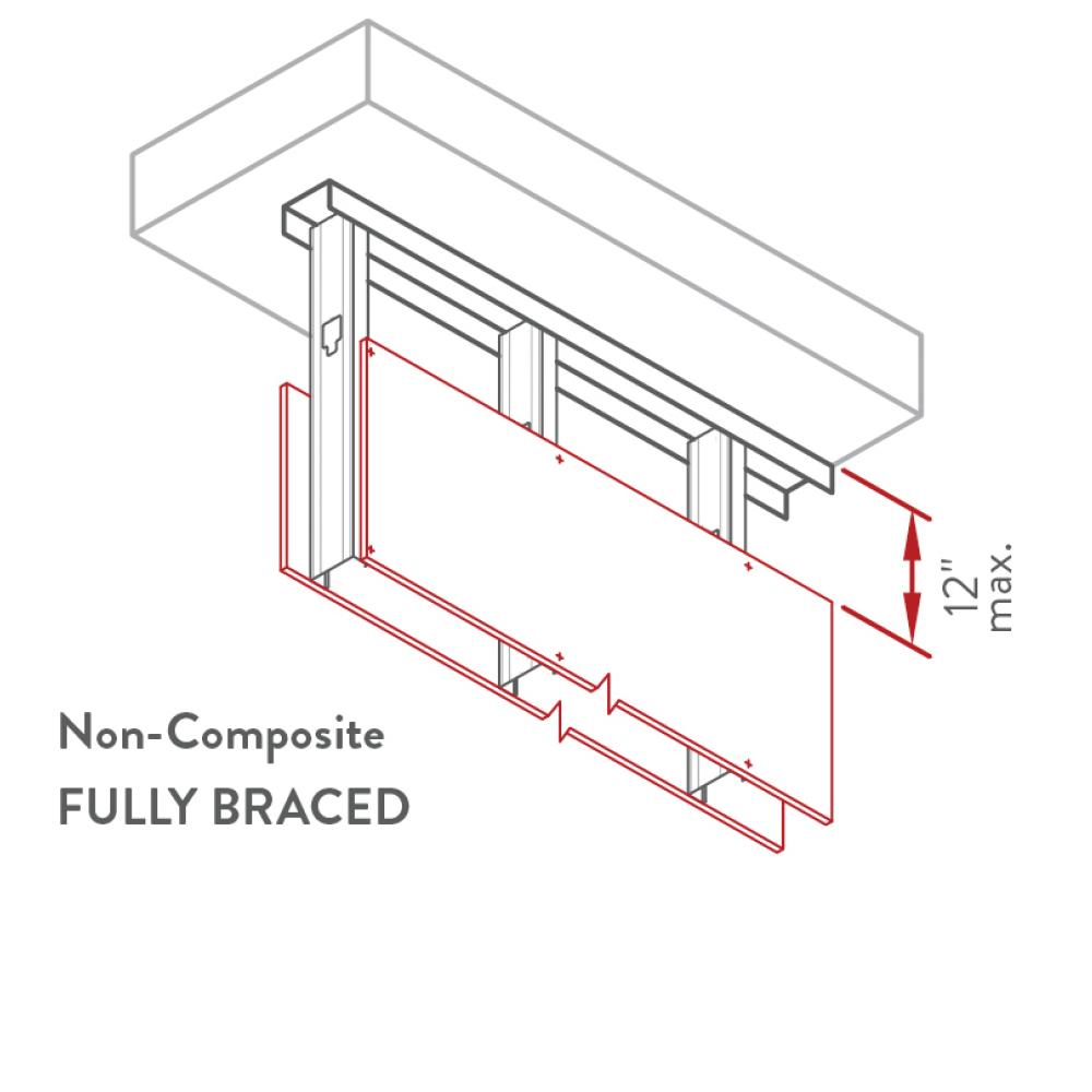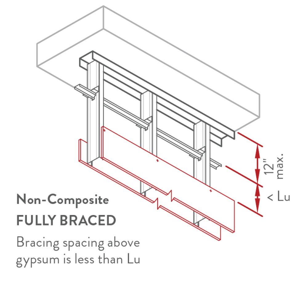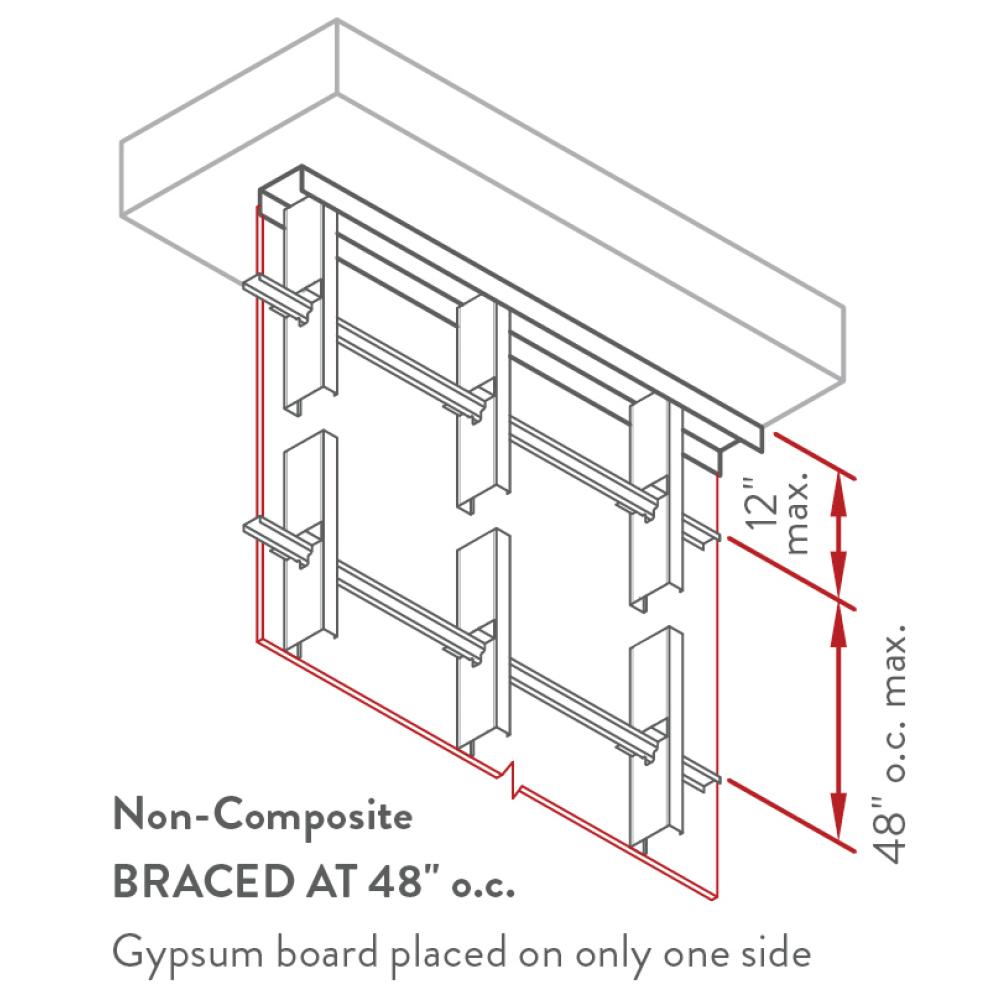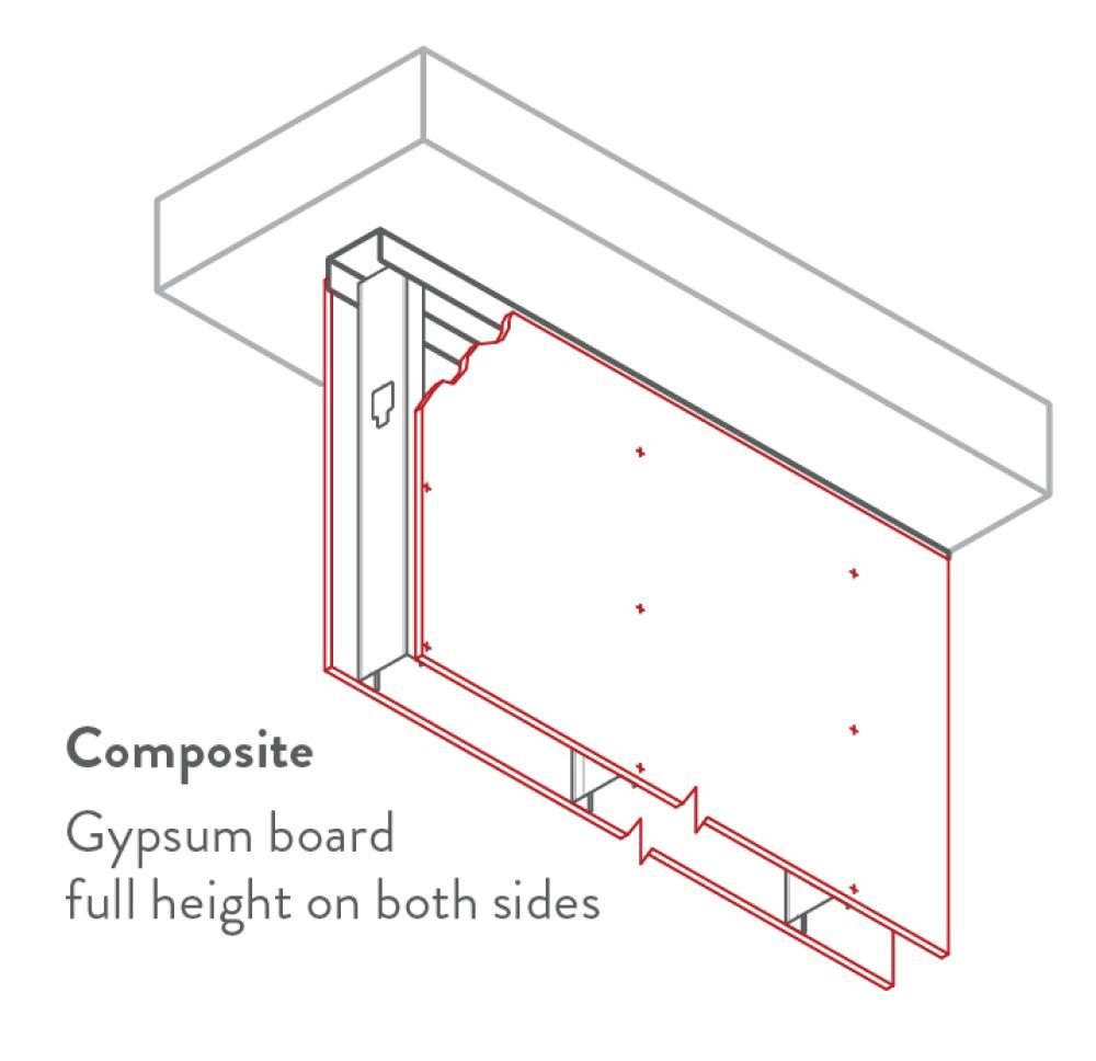 Non-composite conditions are common in all structures. When the gypsum board stops at the ceiling level, but the stud continues to the deck, it is a non-composite condition. While there may be advantages to contacting Technical Services or a Design Professional, many conditions can be covered by limiting heights tables shown below. When in doubt, call our complimentary Technical Services Hotline at 888-437-3244.